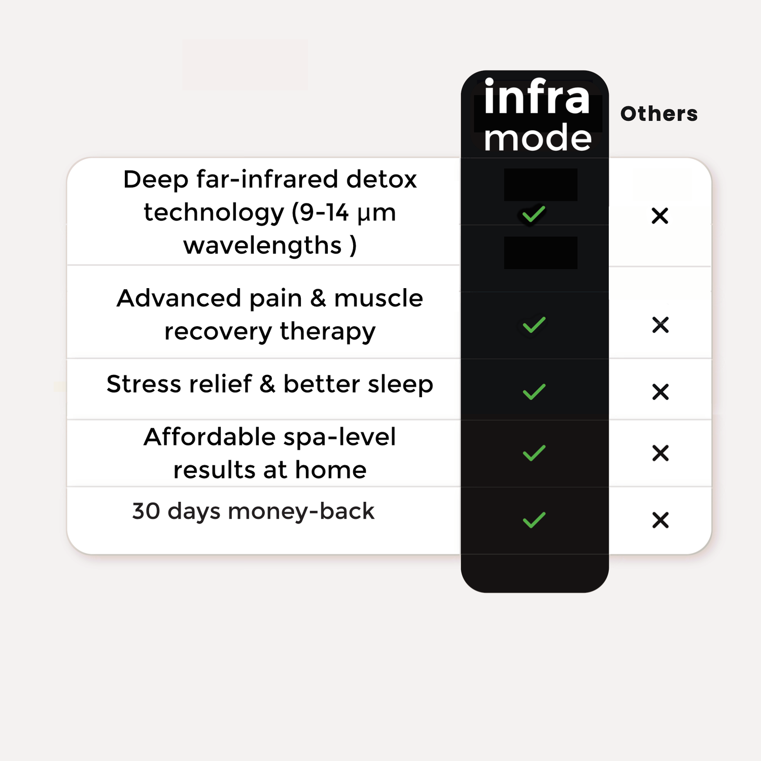 At first I didn’t expect much, but after a week I noticed the same “glow” you get after a steam sauna - minus the public locker rooms. My skin feels smoother and my body feels more balanced overall. Thanks Inframode!